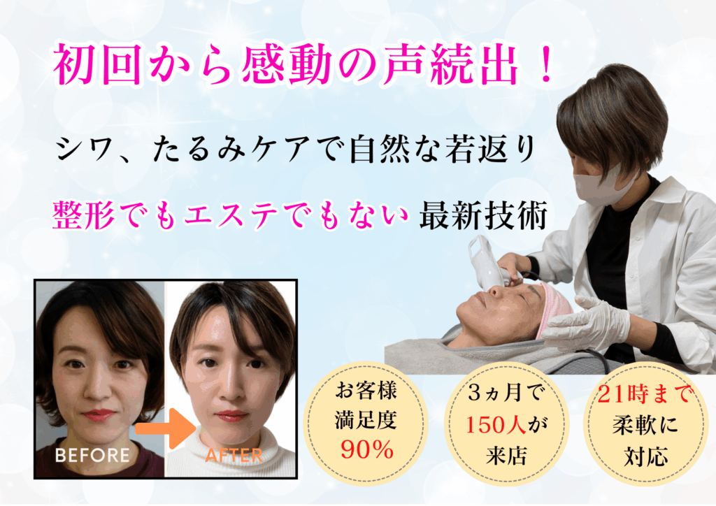 オープンから3ヶ月で150人のお客様にご来店いただき、満足度90%という高い評価をいただいています。リピート率80%という数字が、施術効果と接客品質の高さを証明しています。「早く試せば良かった」との声を多数いただく確かな技術力で、お客様の期待を上回る結果を提供します。
