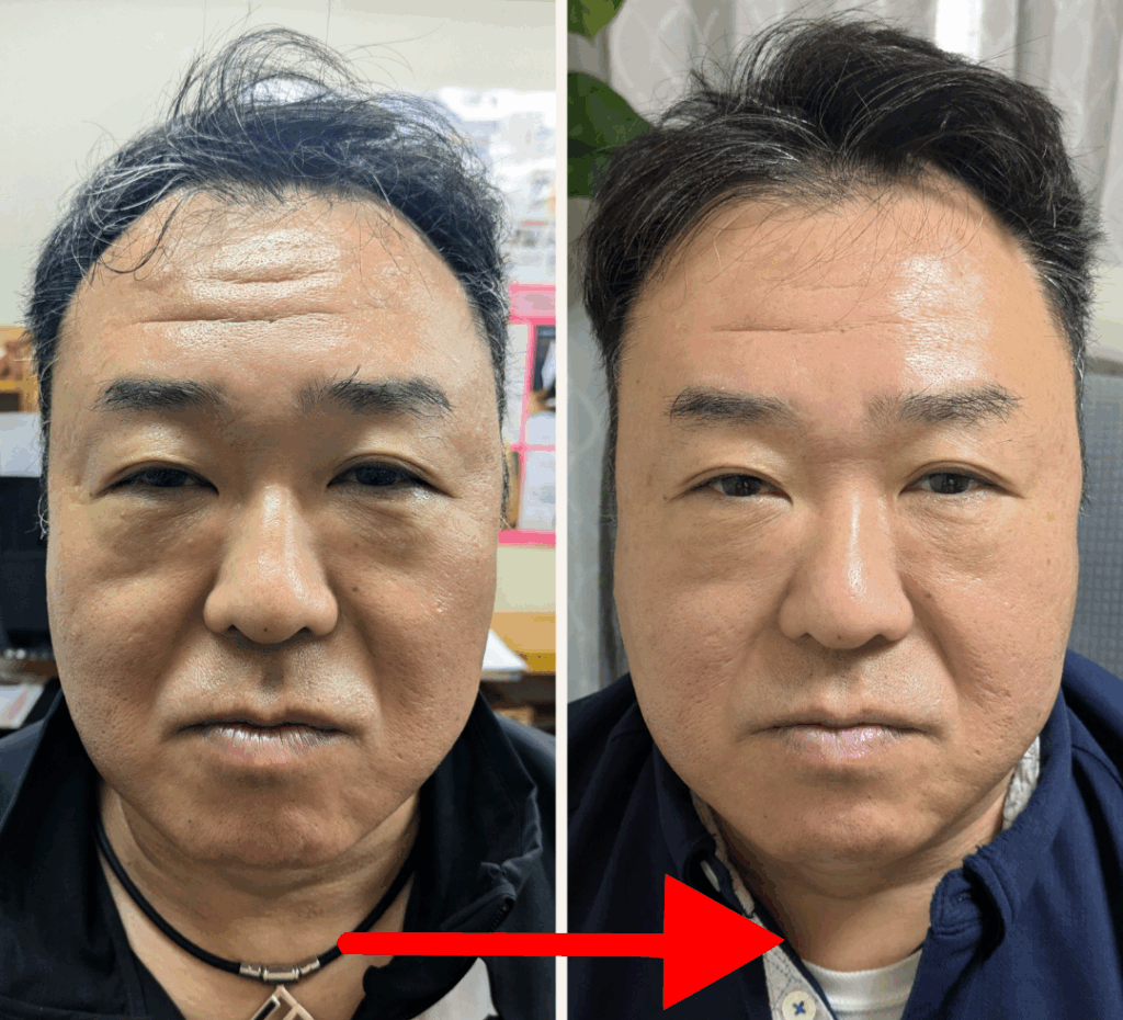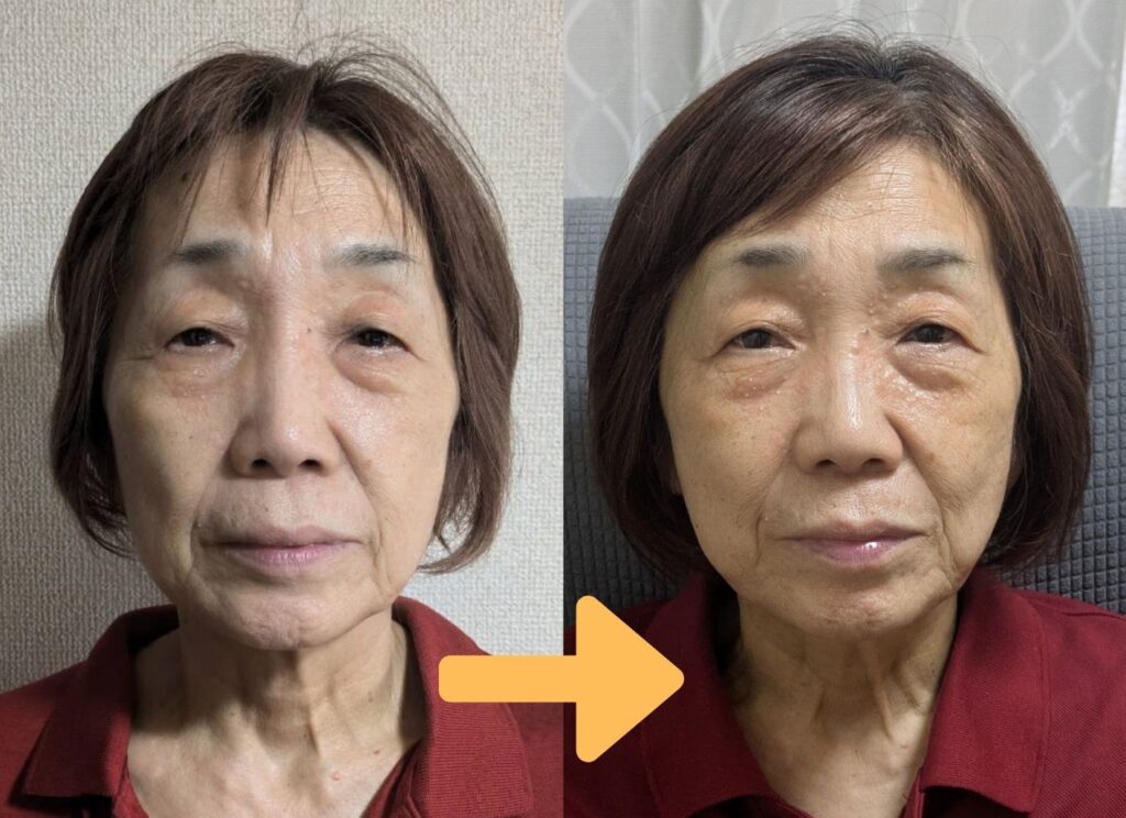 施術後、気になっていた目の下のたるみが徐々に薄くなっていった。顔に立体感が出て、肌トーンが明るくなり、より明るい印象になりました。