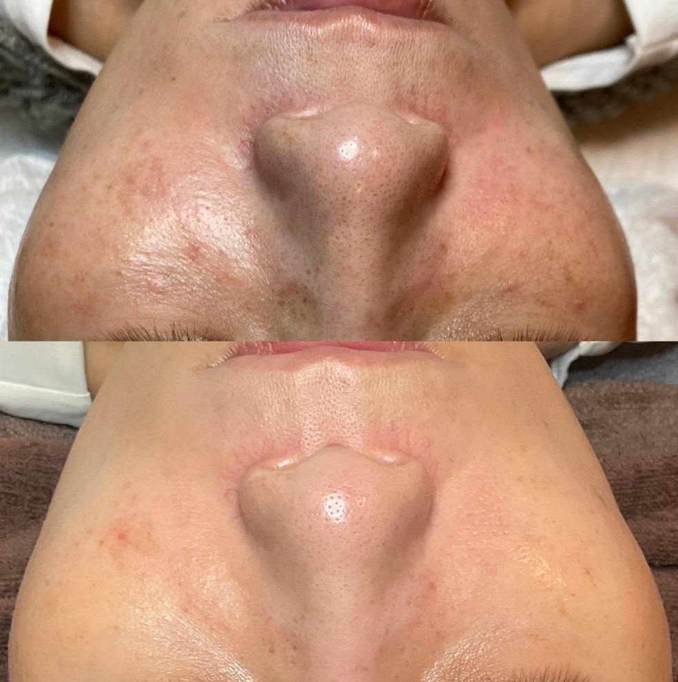 長年赤ら顔やシミに悩まれていた。毎月1回施術され赤みが徐々に薄くなっていった。お肌が固くごわついていた肌がもちもち肌になり、トーンアップしたことで柔らかい印象になった。厚化粧で隠す毎日から解放されたと喜びの声を頂いてます。