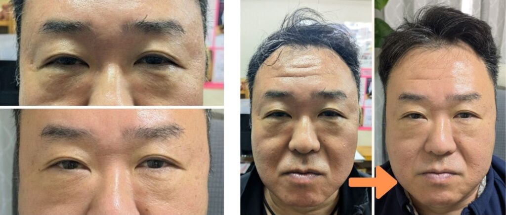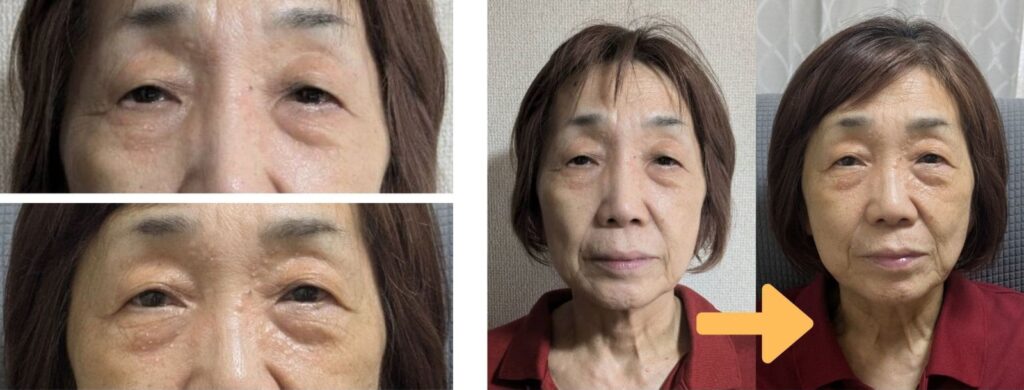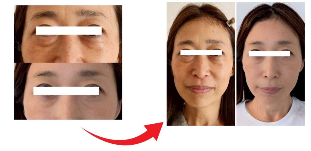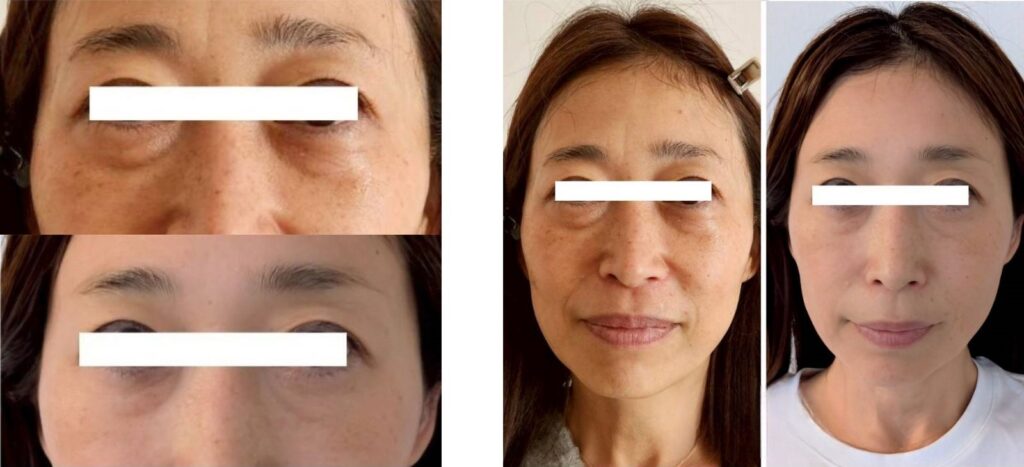 施術後、気になっていた目の下のたるみが徐々に薄くなっていった。顔に立体感が出て、肌トーンが明るくなり、より明るい印象になりました。