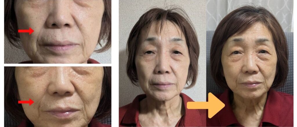 毎月1回施術をされ、顔全体の肌にツヤと口元にハリが出て健康的な肌がもどってきた。瞼が落ちてきて視界が狭くなっていた悩みも少しずつ解消され、最近ではノーファンデで出歩くことも多くなった。